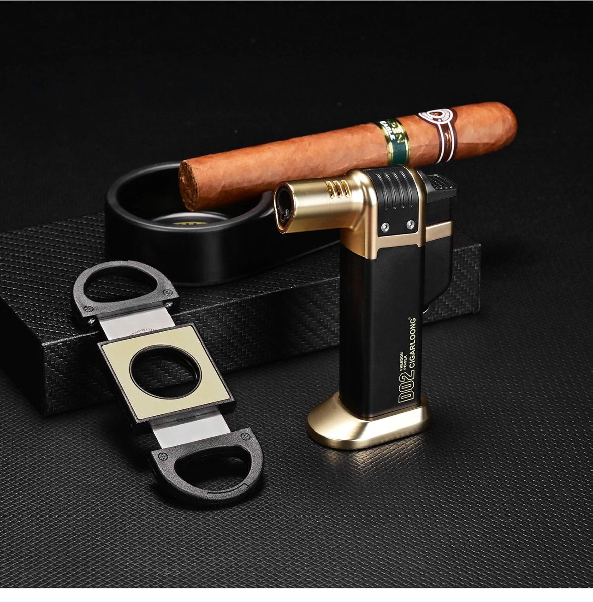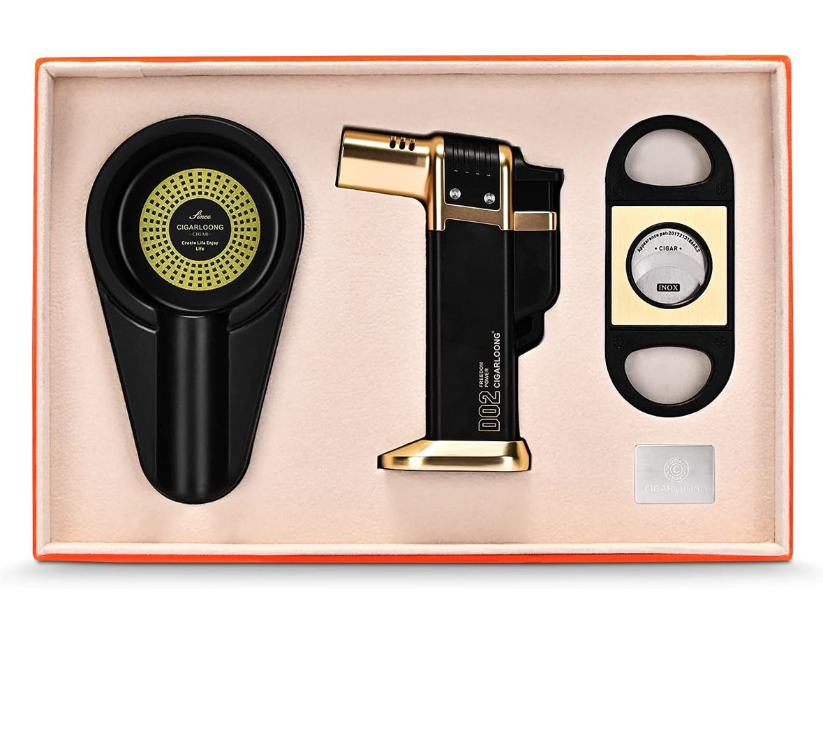 This Classic Set 3/1 includes a Classic Cigar Ashtray, Butane Torch Lighter, and Double Blade Cigar Cutter, along with a Portable Cigar Ashtray (without gas). Perfect for cigar aficionados, this set offers convenience and style with its high-quality materials and sleek design. Upgrade your smoking experience today.