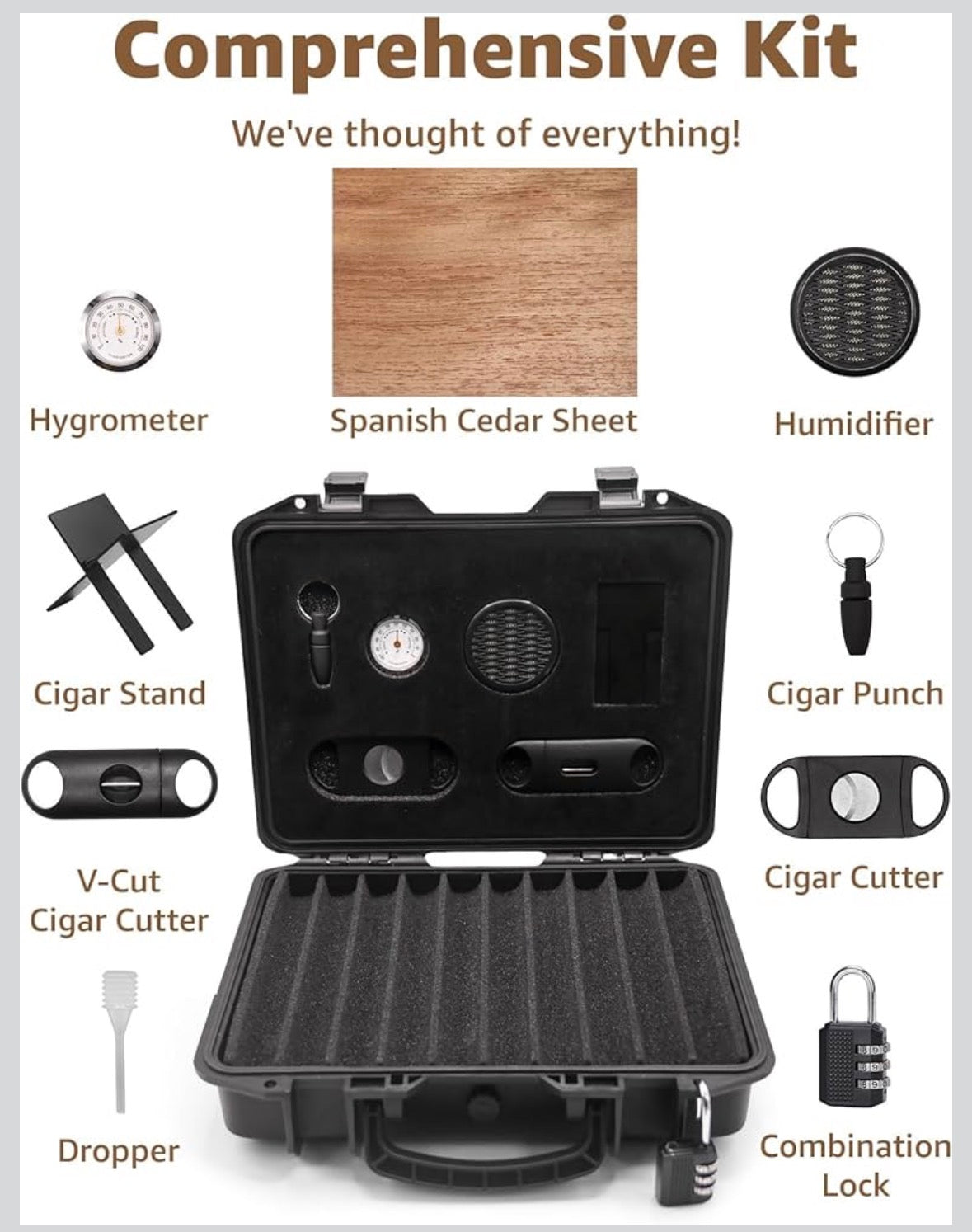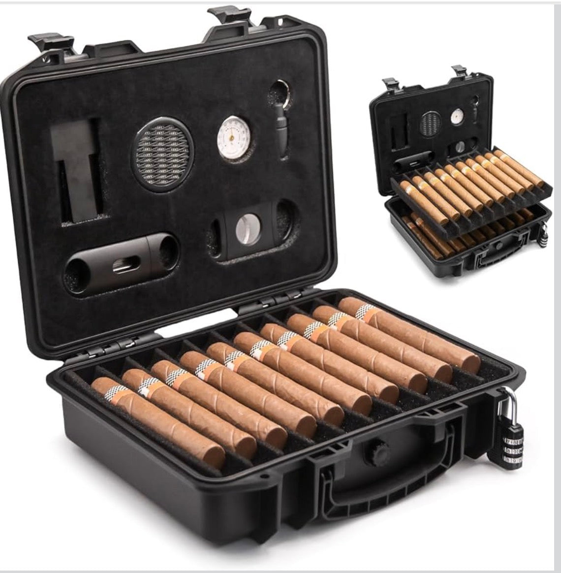 This cigar humidor case is expertly designed for the discerning aficionado who demands optimal cigar preservation on the go. It securely holds up to 20 cigars within an airtight, waterproof, and crushproof shell, ensuring your cigars stay fresh and protected under any conditions. The lockable design adds an extra layer of security, while its durable construction and portable size make it an ideal travel companion. Preserve your cigars’ flavor and aroma effortlessly with this robust, high-performance humidor kit.